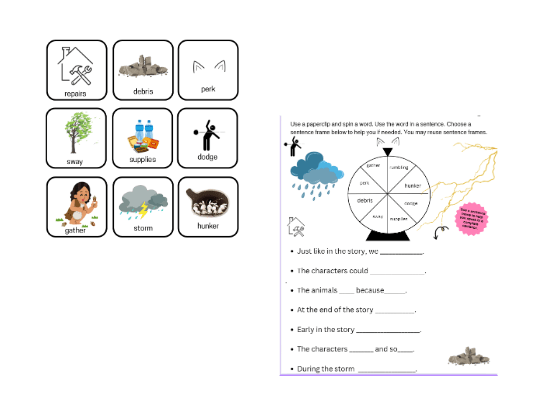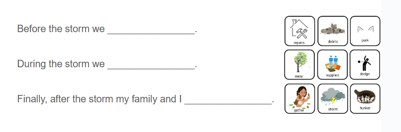 Last, I had students write about what they do before, during and after a storm. It was an easy to implement opportunity to practice speaking with these terms. Here are the sentence frames we utilized: